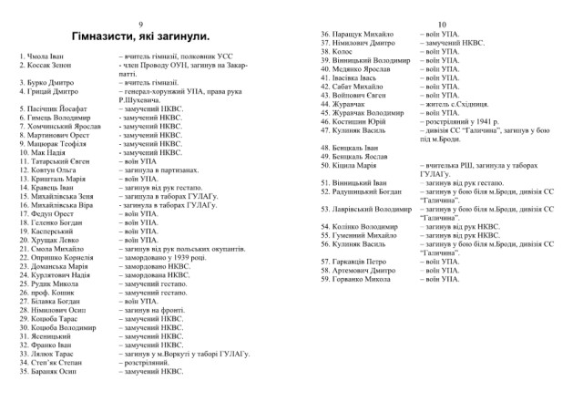 11. Татарський Євген – воїн УПА 50. Кіцила Марія – вчителька РШ, загинула у таборах
